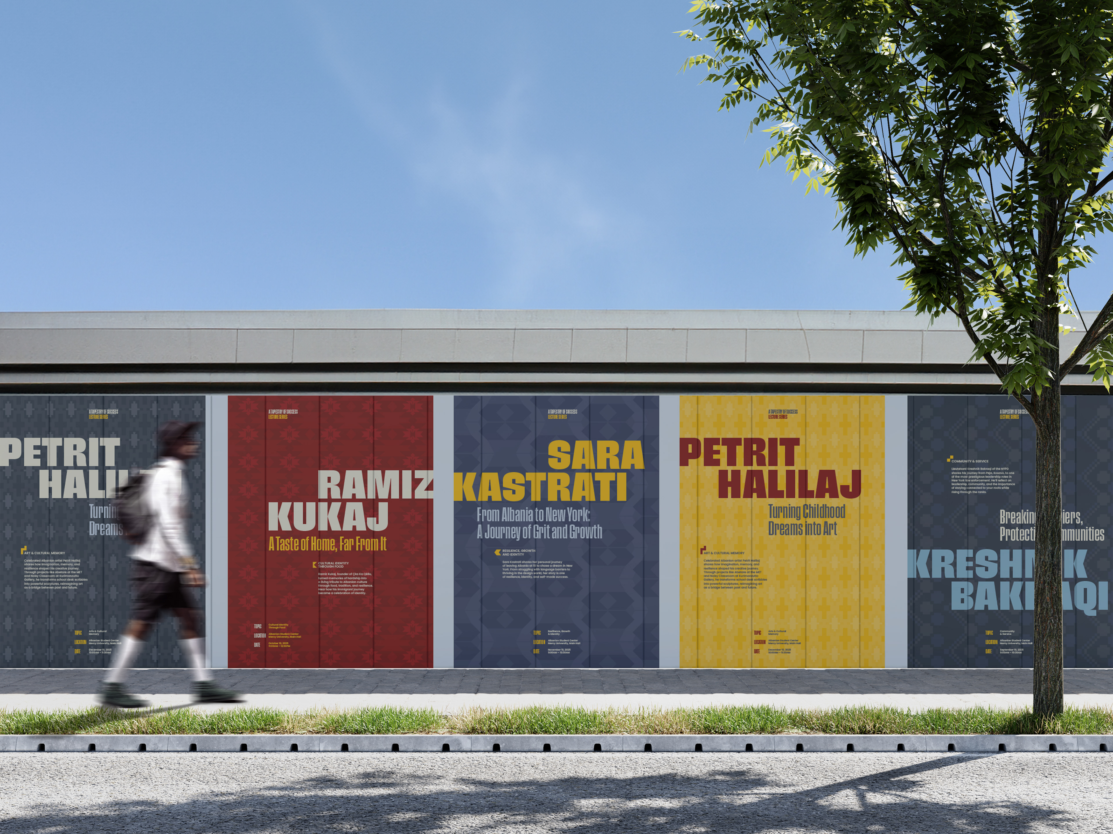 Modernized Albanian motifs, bold geometric type, and a consistent red-toned (inspired by the Albanian flag) palette unify the project, reflecting strength, pride, and cultural identity.